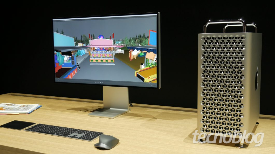 Apple Pro Display XDR ao lado de um Mac Pro (imagem: Paulo Higa/Tecnoblog)