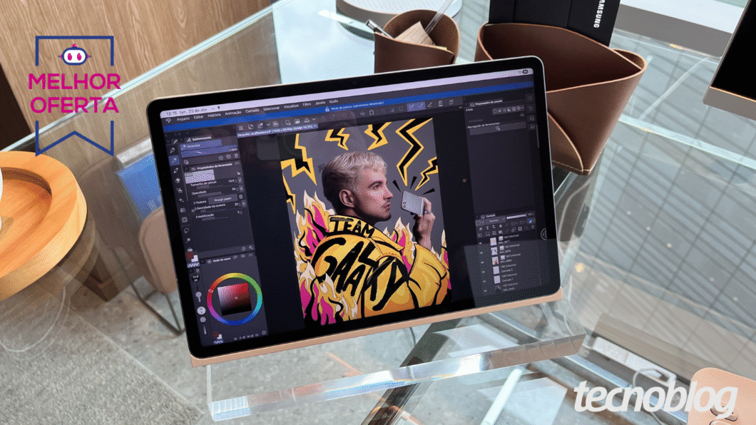 O tablet da Samsung traz tela de 10,9″ com taxa de 90 Hz, 8 GB de RAM e bateria de 8.000 mAh, além de incluir no kit a caneta S Pen e uma capa protetora.